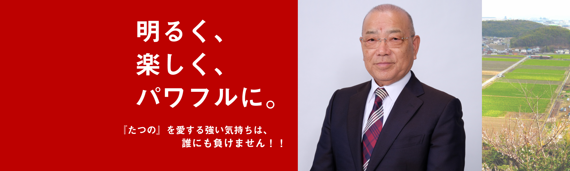 皆さまの声を市政に反映し、本市益々の発展を目指して邁進させていただきます。『明るく、楽しく、パワフルに、』たつのを愛する強い気持ちはだれにも負けません!